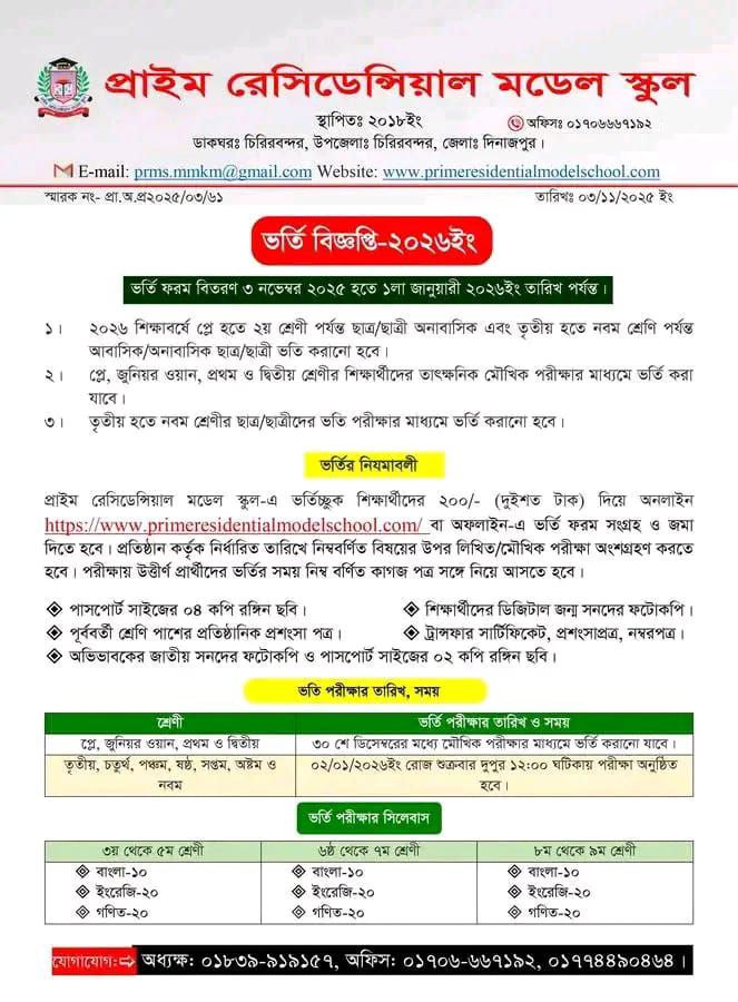 এত দ্বারা প্রাইম রেসিডেন্সিয়াল মডেল স্কুলের সকল ছাত্র ছাত্রী অভিভাবককে জানানো যাচ্ছে যে আগামী ২৫-১২-২০২৫ ইং তারিখে বার্ষিক পরীক্ষার ফলাফল প্রকাশ ফলাফল প্রকাশ করা হবে।
