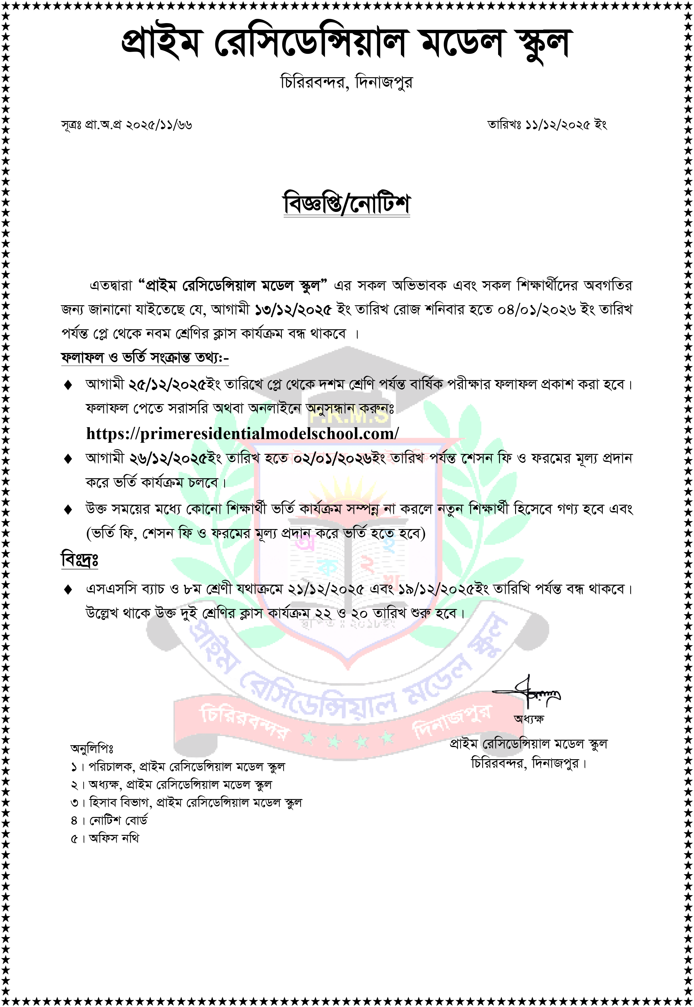 ২০২৫ সালের বার্ষিক পরীক্ষার ফলাফল ও বন্ধের নোটিশ